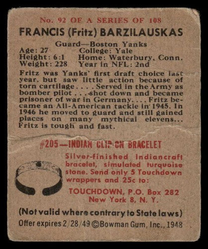 1948 Bowman Francis (Fritz) Barzilauskas #92 GOOD